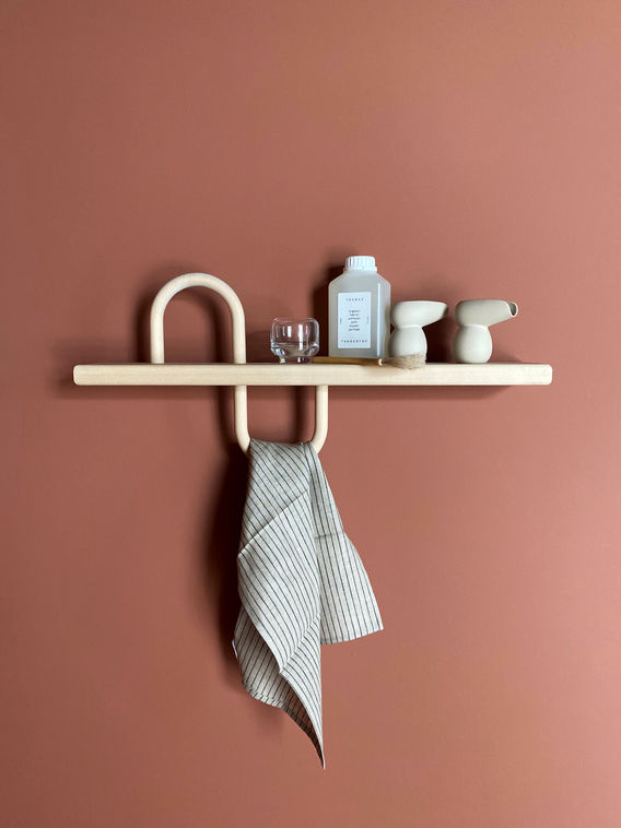 LOOP is a shelf with a twist – literally. A single curve breaks the surface, opening up for playful use. Hang a kitchen towel, a necklace, or even an umbrella. On top, display a magazine, a cookbook, or your favourite photo.